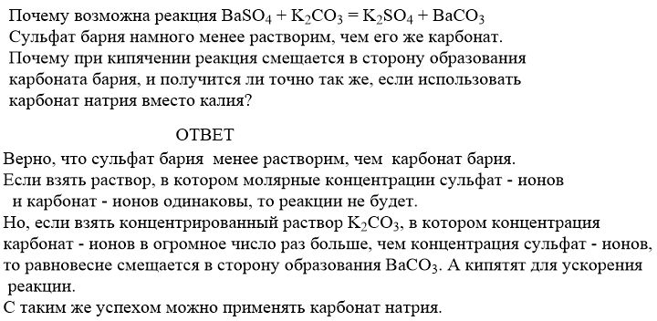 Почему возможна реакция BaSO4 + K2CO3 = K2SO4 + BaCO3 Сульфат бария намного менее растворим, чем его же карбонат. Почему при кипячении реакция смещается в сторону образования карбоната бария, и получится ли точно так же, если использовать карбонат натрия вместо калия?