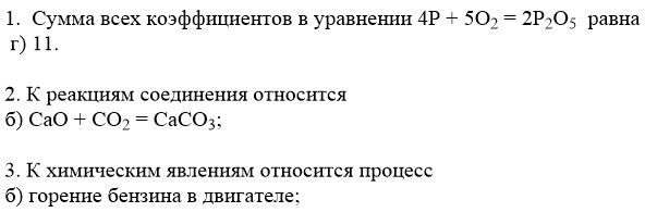 1. Сумма всех коэффициентов в уравнении P + O2 → … равнаа)а)2; б) 7 в) 9 г) 11. 2.К реакциям соединения относитсяа) 2CH4 = C2H2 +3H2; б) CaO + CO2 = CaCO3; в) 2Na + 2HCl = 2NaCl + H2; г) NaOH + HCl = NaCl + H2O.3. К химическим явлениям относится процесса) а)плавление парафиновой свечи; б) горение бензина в двигатели; в) образование росы утром; г) распространение запаха духов.