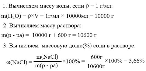 Решите задачу: При солении огурцов на ведро воды 10 л расходуют 600г соли. Определите массовую долю(%) соли в растворе?