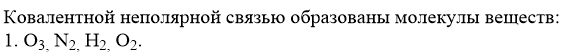 Ковалентной неполярной связью образованы молекулы веществ:1. О3, N2, H2, O22. O2, О3, СО, NH33. NH3, СО, СO2, H2O4. Н2O, O2, N2, H2