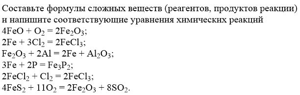 Составьте формулы сложных веществ (реагентов, продуктов реакции) и напишите соответствующие уравнения химических реакцийFe (II) O (II) + O2 - Fe (III) O (II)Fe + Cl2 - Fe (III) Cl (I)Fe (III) O (II) + Al - Fe + Al OFe + P - Fe (II) P (III)Fe (II) Cl (I) + Cl2 - Fe (III) Cl (I)FeS2 + O2 - Fe (III) O (II) + S (IV) O (II)