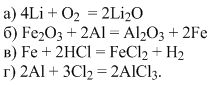 Расставьте коэффициенты, вставьте пропущенные вещества и укажите тип реакций: а) Li+? =Li2O б) Fe2O3+? = Al2O3+? в)?+ 2HCL=FeCl2+H2 г) 2Al+?=2AlCl3.