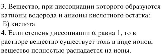 3. Вещество, при диссоциации которого образуются катионы водорода и анионы кислотного остатка: А) соль Б) кислота В) вода Г) щелочь 4. Если степень диссоциации α равна 1, то в растворе вещество...