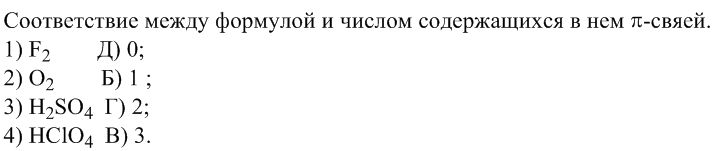 Установите соответствие между формулой и числом содержащихся в нем π-свяей. 1) F2 A) 42) O2 Б) 1 3) H2SO4 В) 3 4) HClO4 Г) 2 Д) 0