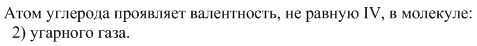 Атом углерода проявляет валентность, не равную 4 (римскими цифрами), в молекуле: 1) углекислого газа 2) угарного газа 3) метана 4) угольной кислоты