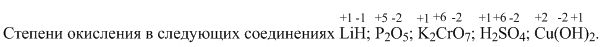 Степени окисления в следующих соединениях LiH; P2O5; K2CrO7H2SO4; Cu(OH)2