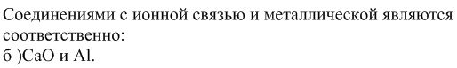 Соединениями с ионной связью и металлической являются соответственно: а) н2о и н2 б )сао и al в) al и н2о г) NaCe b Na2O