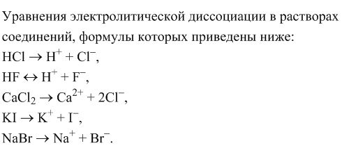 Составьте уравнения электролитической диссоциации в растворах соединений формулы которых приведены ниже: HCl, HF.CACL2.KI.NABR