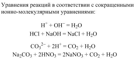 Осуществите реакции в соответствии с сокращенным ионно-молекулярными уравнениями: H(+)+OH(-)=H2O CO(-2)3+2H(+)=CO2+H2O