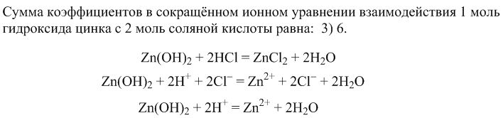 Сумма коэффициентов в сокращённом ионном уравнении взаимодействия 1 моль гидроксида цинка с 2 моль соляной кислоты равна: 1)7 2)5 3)6 4)4