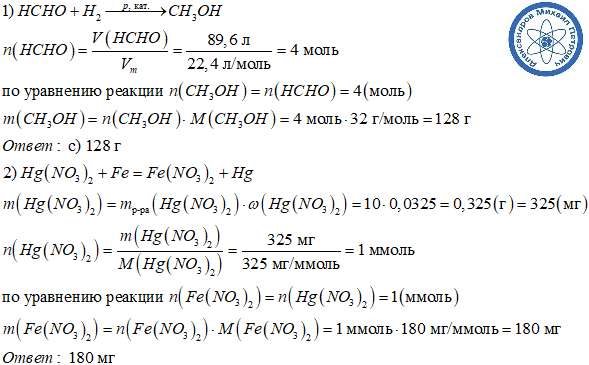 Тесты, Тесты, Тесты Каталитическому гидрированию избытком водорода подвергли метаналь объемом 89,6 л (н. у.). Масса образовавшегося метанола равна Выберите один ответ: a. 64 г b. 8,96 г c. 128 г d. 32 г В 10 г 3,25%-ного раствора нитрата ртути (II) опустили железную пластинку. Масса соли железа в образовавшемся растворе (в мг) равна Выберите один ответ: a. 320 b. 125 c. 64 d. 152