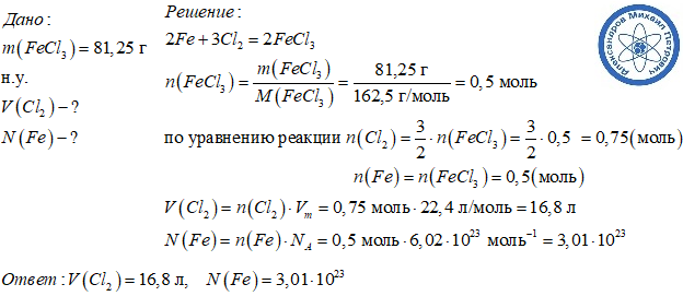 Определить объем хлора (н.у.), необходимый для получения 81.25 г хлорида железа(3). Сколько атомов железа вступает в реакцию?