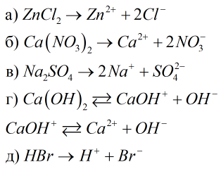 Напишите уравнения диссоциации следующих веществ: а) Хлорид цинка; б) Нитрат кальция; в) Сульфат натрия; г) Гидроксид кальция; д) Бромоводородная кислота