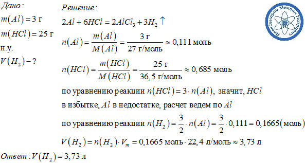 Вычислить объём водорода, который получили при взаимодействии 3 г алюминия с 25 г соляной кислотой