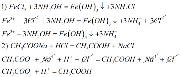 Молекулярное и ионное уравнение реакций FеС13 и NH4ОН; СН3СООNа и НСI.