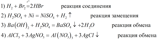 Составьте уравнения реакции и укажите их тип. Расставьте коэффициенты там, где это необходимо. 1.водород+бром=бромид водорода 2.серная кислота+никель=сульфат никеля+водород 3.гидроксид бария+серная кислота=сульфат бария+вода 4.хлорид алюминия+нитрат серебра=нитрат алюминия+хлорид серебра