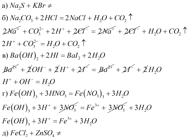 Закончите уравнения, запишите в молекулярном и ионном виде а)NaS+KBr; б)Na(2)CO3+HCl; в)Ba(OH)2+HI; г)Fe(OH)3+HNO3; д)FeCl2+ZnSO4;