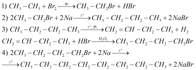 Составьте уравнения реакций с помощью которых можно осуществить следующие превращения : этан- бромэтан- бутан- хлорбутан - октан
