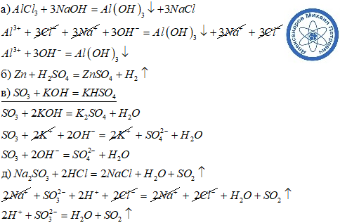 Закончить возможные уравнения реакций. Реакции обмена записать в ионном виде. а)AlCl3 + NaOH б)Zn + H2SO4 в)SO3+ KOH г)KNO3 + NaCl д)Na2SO3 +HCl е)Ba(OH)2 + KOH