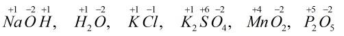 Определить степень окисления всех элементов в следующих соединениях: NaOH, H2O, KCl, K2SO4, MnO2, P2O5.