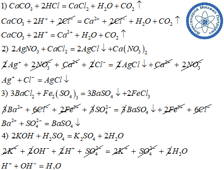 Написать в молекулярном полном и сокращенном ионном уравнении следующие вещества : 1) Ca CO₃ + HCI , 2) Ar NO₃ + Ca CI₂ 3) Ba CI₂ + Fe₂(SO₄)₃, 4) KOH + H₂SO₄.
