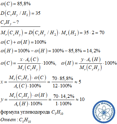 Выведите молекулярную формулу углеводорода,в котором массовая доля равна 85,8%. относительная плотность его по водороду 35
