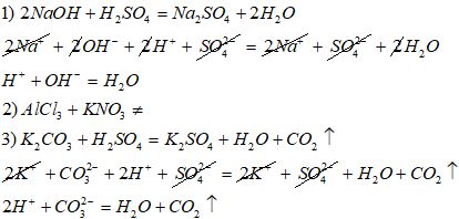 Составить уравнения реакций в молекулярном и ионном виде NaOH+H2SO4= AlCl3+KNO3= K2CO3+H2SO4=