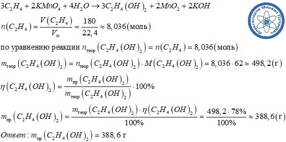 Сколько килограмм этиленгликоля можно получить из 180 л этилена, если выход 78%?