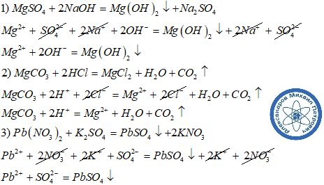 Записать в молекулярном, полном и сокращенном ионном виде химические реакции: MgSO4+NaO - MgCO3+HCL- Pb(NO3)2+K2 SO4 -