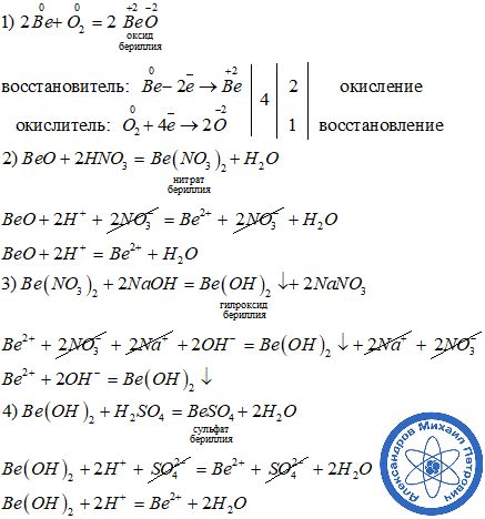 Осуществите цепочку превращений,Укажите условия протекания реакций: BE-BEO- BE(NO3)2-BE(OH)2-BESO4 Реакции рассматривать в свете теории ОВР и ТЭД . Дать названия полученным соединениями.