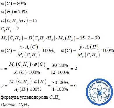 Определите молекулярную формулу газообразного углеводорода, если массовая доля углерода в нем составляет 80 %, а массовая доля водорода - 20%. Относительная плотность данного газа по водороду равна 15.
