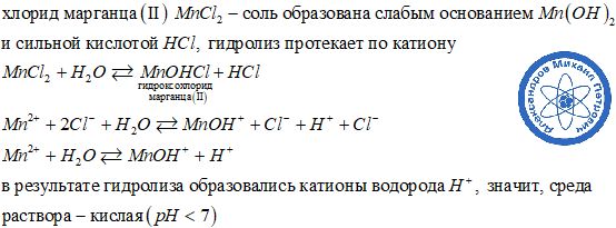 Напишите ионно-молекулярные и молекулярные уравнения гидролиза по I ступени и укажите реакцию среды (рН) водного раствора соли хлорида марганца (II). Назовите полученное соединение.