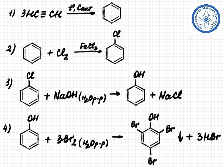 Написать уравнение реакций,при помощи которых можно осуществить следущие превращения: эцителен------>бензол ------>хлорбензол ------>фенол ------> 2,4,6 трибромфенол