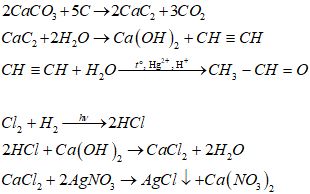 1 карбонат кальция—карбид кальция—ацетилен—ацетальдегид 2 хлор—соляная кислота—хлорид кальция—хлорид серебра