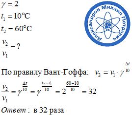 Температурный коэффициент реакции равен 2 .Определите во сколько раз увеличиться скорость химической реакции от повышения температуры от 10 до 60 градусов ?