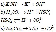 Напишите уравнение электролитичесой диссоции для следующих веществ: а) KOH б) H2SO4 в) Na2CO3