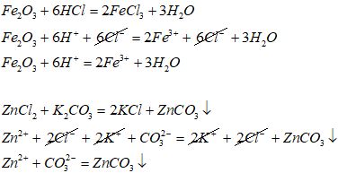 Составте уравнения реакций ионного обмена FeO3 + HCl ZnCl2 + K2Co3