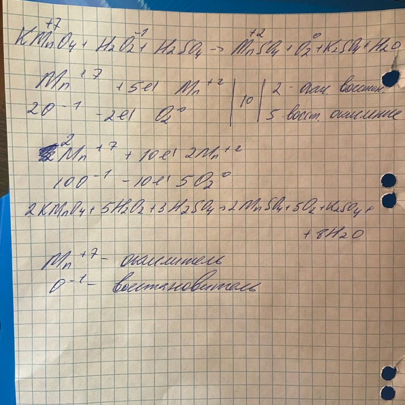 Составить окислительно восстановительную реакцию, подобрать коэфициенты KMnO4+H2O2+H2SO4=MnSO4+O2+K2SO4+H2O