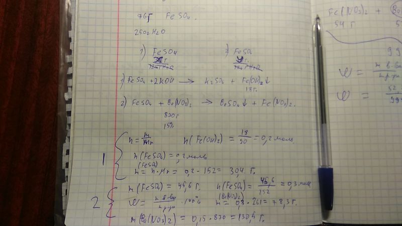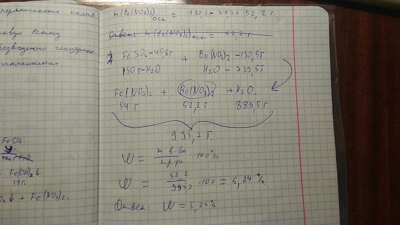 :Растворимость сульфата железа(2) при определённой температуре равна 30,4 на 100 мл воды. К 250 мл воды добавили необходимое количество сульфата железа. Раствор разделили на 2 части. К 1 части прилили избыток раствора гидроксида калия, при этом образовался осадок массой 18г. Ко 2-ой части раствора прилили 870 г 15%-ного водного раствора нитрата бария. Вычислите массовую долю нитрата бария в образовавшемся растворе.