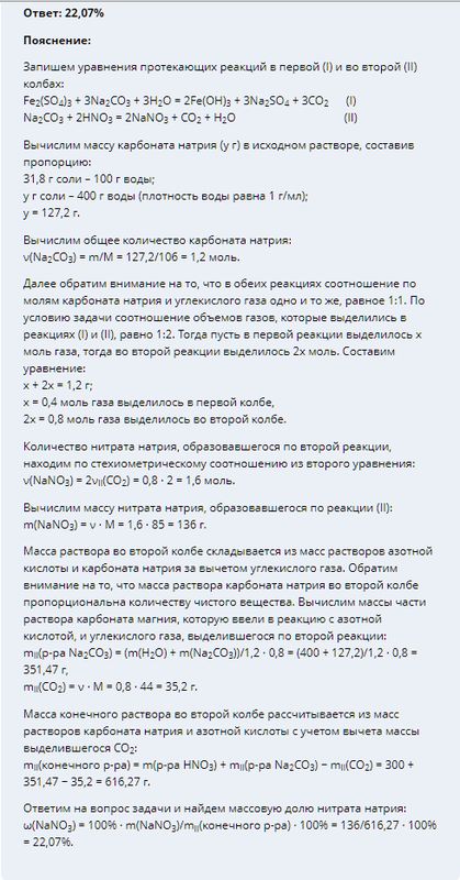 Растворимость безводного карбоната натрия при некоторой температуре составляет 31,8 г на 100 г воды. При этой температуре приготовили насыщенный раствор, добавив необходимое количество карбоната натрия к 400 мл воды. Раствор разлили в две колбы. К раствору в первой колбе добавили избыток раствора сульфата железа(III). К раствору во второй колбе добавили 300 г раствора азотной кислоты, также взятой в избытке. При этом, объём газа, выделившийся из второй колбы, оказался в 2 раза больше объёма газа, выделившегося из первой колбы. (Объёмы газов измерены при одинаковых условиях). Определите массовую долю нитрата натрия в конечном растворе во второй колбе