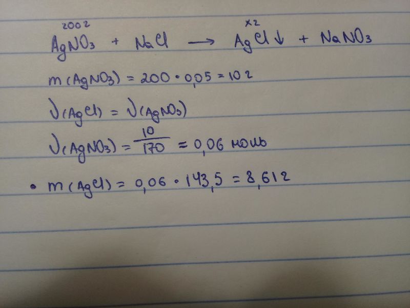 Определить массу осадка, образующегося в реакции 200 г раствора нитрата серебра массой 200 и массовой долей растворенного вещества 5% с раствором хлорида натрия.