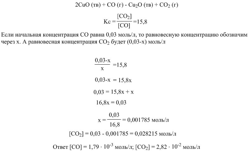 Химия Рассчитайте равновесные концентрации исходных веществ и продуктов Для реакции с заданной константой равновесия Kс и начальными концентрациями газообразных исходных веществ C0 рассчитайте равновесные концентрации исходных веществ и продуктов: 2CuO (тв) + CO (г) ↔ Cu 2O (тв) + CO 2 (г) Kс = 15,8 C0 моль/л = 0,03