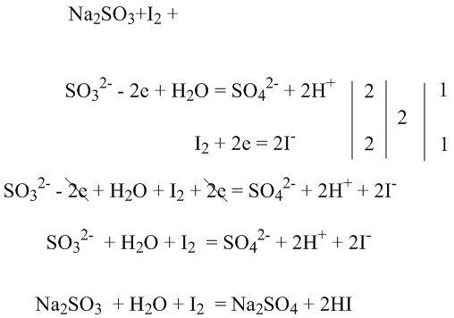 Составить уравнение реации. В пробирку наливают раствор йода, прибавляют раствор сульфита натрия и 1-2 капли серной кислоты. Что наблюдается? Напишите уравнение реакции. Подберите коэффициенты ионно-электронным методом. Вообщем, попробовал Na2SO3+I2+ H2SO4, но после составления полуреации получается, что в здесь вообще не должно быть кислоты. Ведь 2 иона водорода должны уйти на HI. И в левой части получается молекула воды, а по заданию нужно ведь кислую среду.