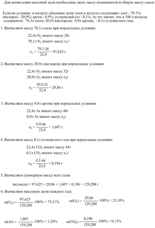 Как узнать массовую долю какого-либо элемента вещества, зная его объемную долю? Как узнать массовую долю какого-либо элемента вещества, зная его объемную долю? (Задание: вычислить массовые доли азота и кислорода в воздухе, если объемные доли элементов в воздухе следующие: азот - 78.1%; кислород - 20,9%; аргон - 0,9%; углекислый газ - 0,1% (Нужно именно ВЫЧИСЛИТЬ, а не написать ответ)). Заранее благодарю за помощь.