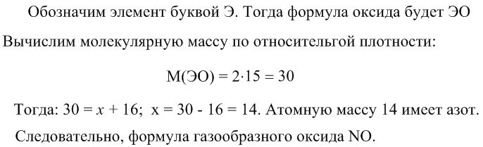 Выведи формулу газообразного оксида, молекула которого состоит из двух атомов, если его относительная плотность по водороду - 15