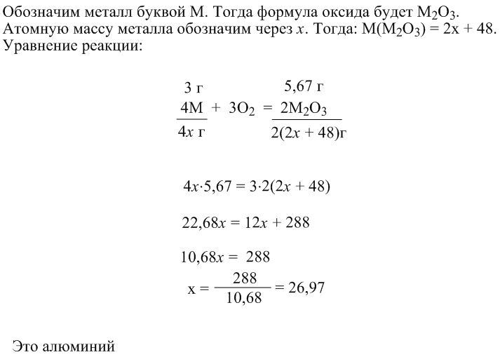 При сгорании металла массой 3 г образуется его оксид массой 5,67 г. Валентность металла в оксиде равняется трем. Определите этот металл