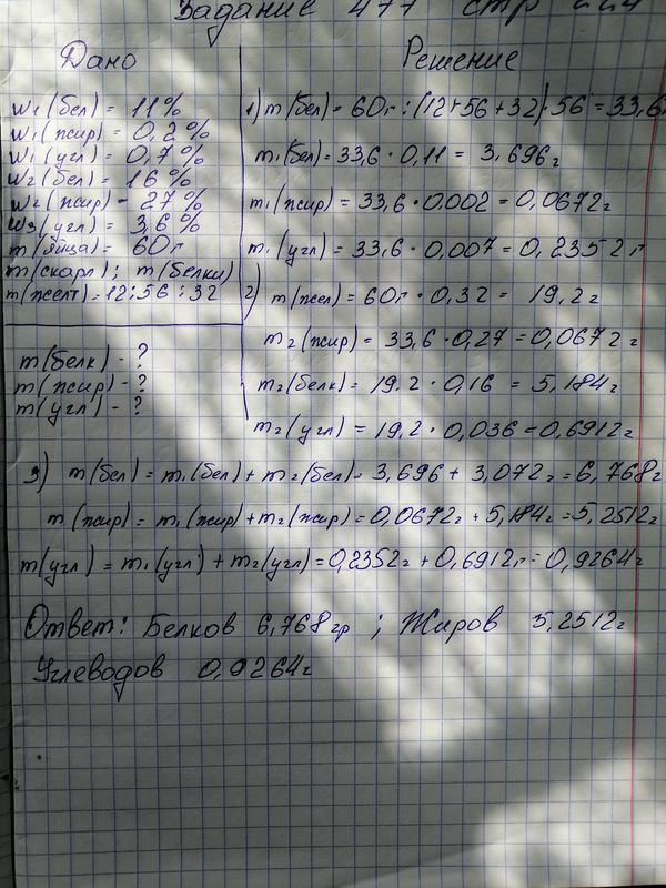 в белке куриного яйца массовая доля белков составляет 11 %, жиров 0,2 %, углеводов 0,7 %, а остальное вода и неорганические соли. В желтке куриного яйца массовая доля белков составляет 16 %, жиров 27 %, углеводов 3,6 %, остальное вода, холестерин и витамины. Средняя масса куриного яйца равна 60г, а масса скорлупы белка и желтка соотносятся как 12:56:32 . Вычислите массу белков, жиров и углеродов, которые получает человек с одним куриным яйцом.