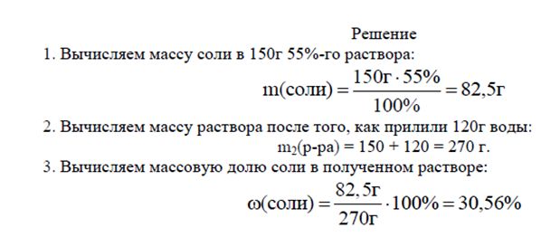 К 150г 55%-го раствора соли прилили 120г воды.Найти массовую долю соли