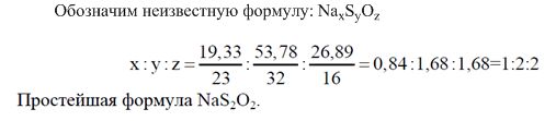 Определите простейшую формулу соединения в которой массовые доли для натрия ,серы и кислорода ,соответсвенно равны :19,33% и 53,78 %.Относительно атомные массы элементов рваны Ar(Na)=23,Ar(S)=32,Ar(O)=16