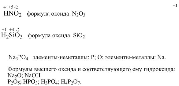 1)Определите степень окисления каждого элемента в соединениях,формулы которых:HNO2,H2SiO3. Запишите формулы оксидов,соответствующих кислотам. 2)дана соль-фосфат натрия. А)Назовите элементы-не металлы,входящие в состав этой соли.Назовите элементы-металлы,входящие в состав этой соли. Б)для элементов натрия и фосфора запишите формулу высшего оксида и соответствующего ему гидроксида.
